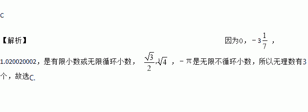 在实数0, ,﹣3,1.020020002, ,﹣π中,无理数有( )