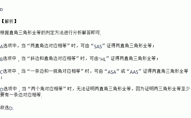 C. 一条边和一锐角对应相等 D. 两个角对应相等