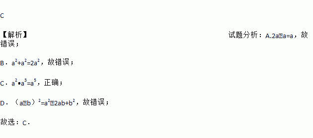 C 【解析】试题分析:A.2a﹣a=a,故错误; B.a2+a2=2a2,故错误; C.a2•a3=a5,正确; D.(a﹣b)2=a2﹣2ab+b2,故错误; 故选:C.