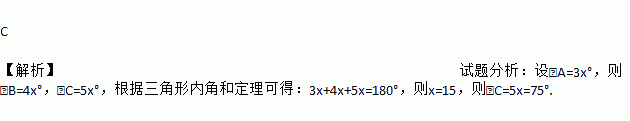 C 【解析】试题分析:设∠A=3x°,则∠B=4x°,∠C=5x°,根据三角形内角和定理可得:3x+4x+5x=180°,则x=15,则∠C=5x=75°.