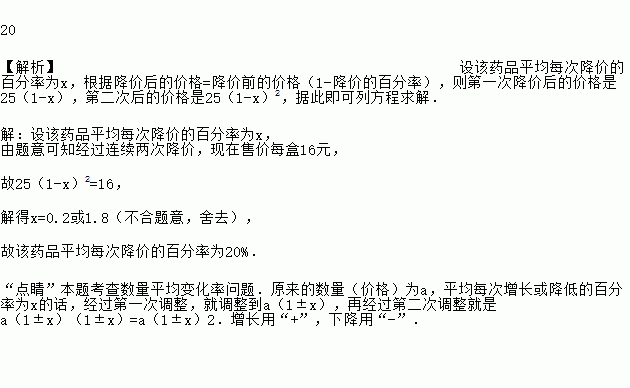 20 【解析】设该药品平均每次降价的百分率为x,根据降价后的价格=降价前的价格(1-降价的百分率),则第一次降价后的价格是25(1-x),第二次后的价格是25(1-x)2,据此即可列方程求解. 【解析】 设该药品平均每次降价的百分率为x, 由题意可知经过连续两次降价,现在售价每盒16元, 故25(1-x)2=16, 解得x=0.2或1.8(不合题意,舍去), 故该药品平均每次...