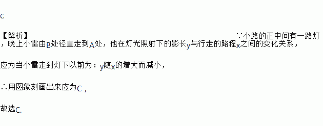 如图,在一条笔直的小路上有一盏路灯,晚上小雷从点B处径直走到点A处时,小雷在灯光照射下的影长y与行走的路程x之间的函数图象大致是( )