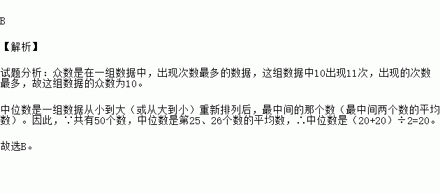 四川雅安发生地震灾害后,某中学九(1)班学生积极捐款献爱心,如图是该班50名学生的捐款情况统计,则他们捐款金额的众数和中位数分别是