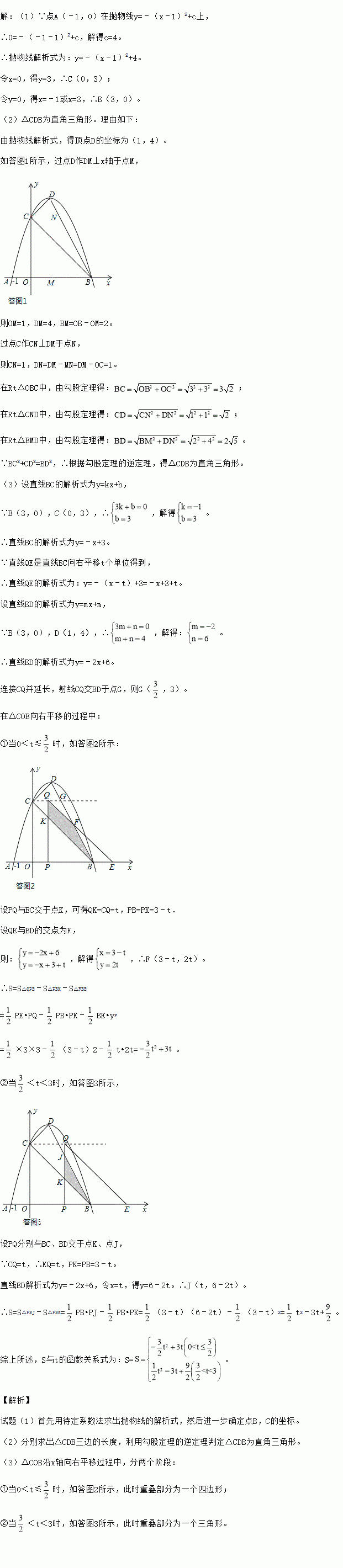 如图,抛物线y=﹣(x﹣1)2+c与x轴交于A,B(A,B分别在y轴的左右两侧)两点,与y轴的正半轴交于点C,顶点为D,已知A(﹣1,0).