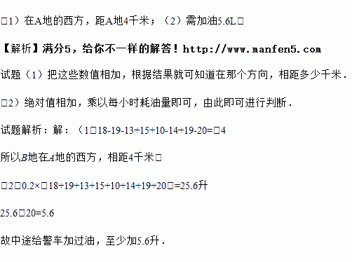 (2)若该警车每千米耗油0.2L,警车出发时,油箱中有油20L,请问中途有没有给警车加油?若有,至少加多少升油?请说明理由.