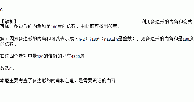 C 【解析】利用多边形的内角和公式可知,多边形的内角和是180度的倍数,由此即可找出答案. 【解析】 因为多边形的内角和可以表示成(n-2)?180°(n≥3且n是整数),则多边形的内角和是180度的倍数, 在这四个选项中是180的倍数的只有4320度. 故选C. 本题主要考查了多边形的内角和定理,是需要识记的内容.
