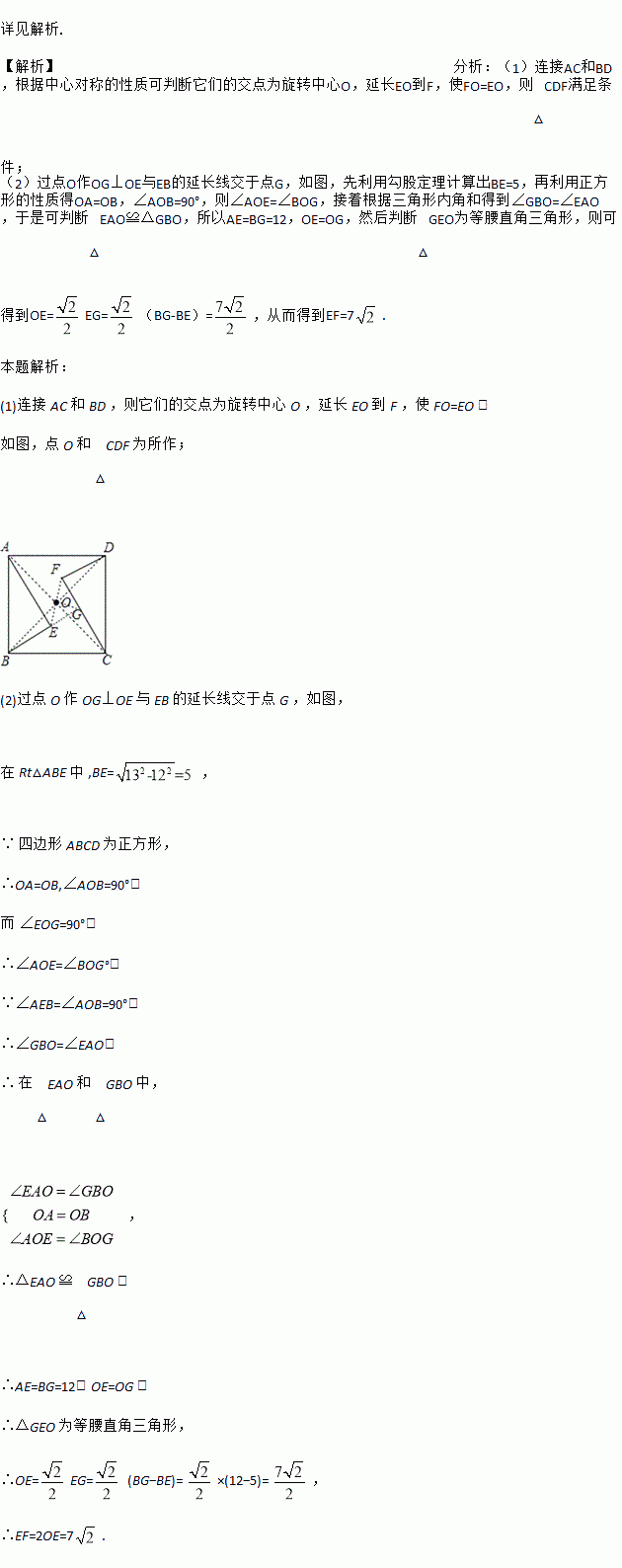如图,正方形ABCD和直角△ABE,∠AEB=90°,将△ABE绕点O旋转180°得到△CDF