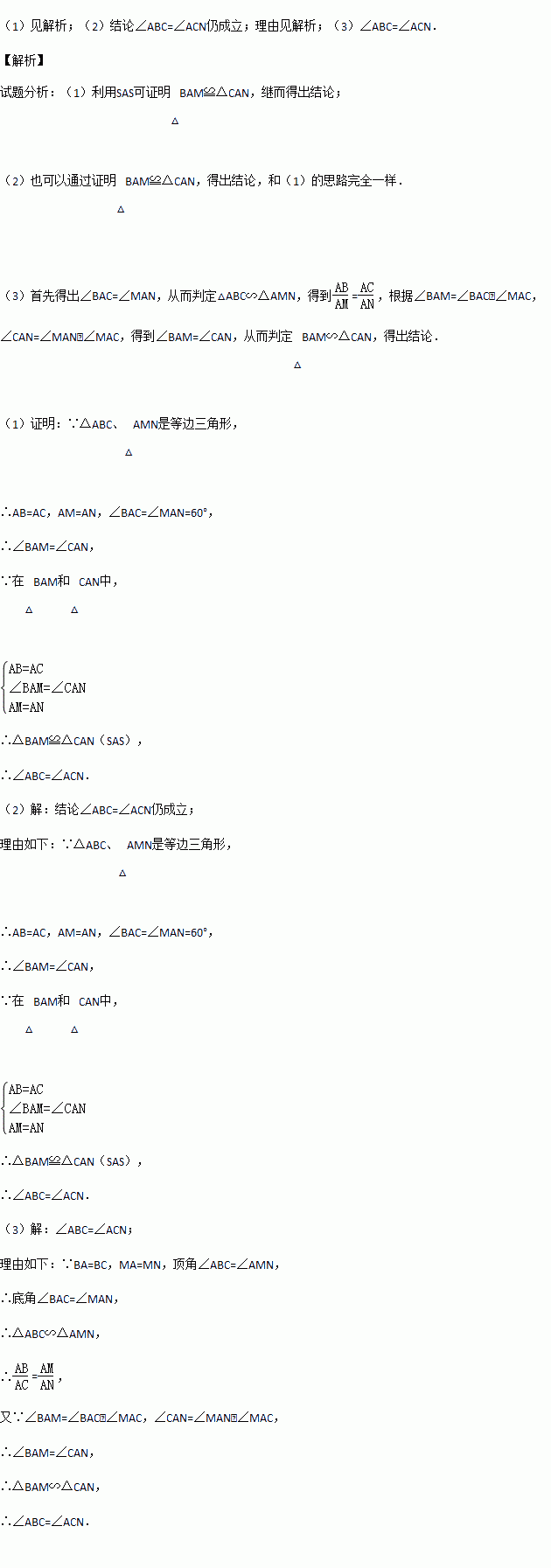 (1)如图1,在等边△ABC中,点M是BC上的任意一点(不含端点B、C),连结AM,以AM为边作等边△AMN,连结CN.求证:∠ABC=∠ACN.