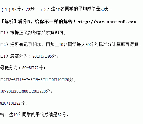 初一某班抽查了10名同学的期中数学考试成绩,以80分为标准,超出80分的都记为正数,不足80分的部分记为负数,结果如下:+8,-3,+15,-7,-5,+9,-8,+1,0,+10.