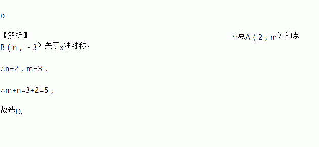 D 【解析】∵点A(2,m)和点B(n,-3)关于x轴对称, ∴n=2,m=3, ∴m+n=3+2=5, 故选D.