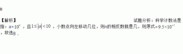 某细胞的直径是0.00000095米,将0.00000095用科学计数法表示为( )。