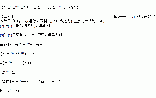 (1) xn+xn-1+xn-2+…+x+1;(2)22 018-1.(3)1. 【解析】试题分析:(1)根据已知发现结果的规律:按x进行降幂排列,各项系数为1,直接写出结论即可; (2)将(1)中的规则逆用,计算即可; (3)将(1)中结论逆用,列出方程,求解即可. 解:(1)xn+xn-1+xn-2+…+x+1 (2)22 017+22 016+…+2+1 =(...