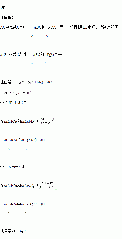 如图,有一个直角△ABC,∠C=90°,AC=6,BC=3,一条线段PQ=AB,P、Q两点分别在AC和过点A且垂直于AC的射线AX上运动,问:当AP=________时,才能使以点P、A、Q为顶点的三角形与△ABC全等.