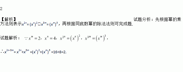 2 【解析】试题分析:先根据幂的乘方法则表示x2n= (xn)2,x3m= (xm)3,再根据同底数幂的除法法则可完成题. 试题解析: ∴x2n-3m= x2n÷x3m =(xn)2÷(xm)3 =16÷8=2.