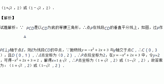 如图,抛物线y=﹣x2+2x+3与y轴交于点C,点D(0,1),点P是抛物线上的动点.若△PCD是以CD为底的等腰三角形,则点P的坐标为 .