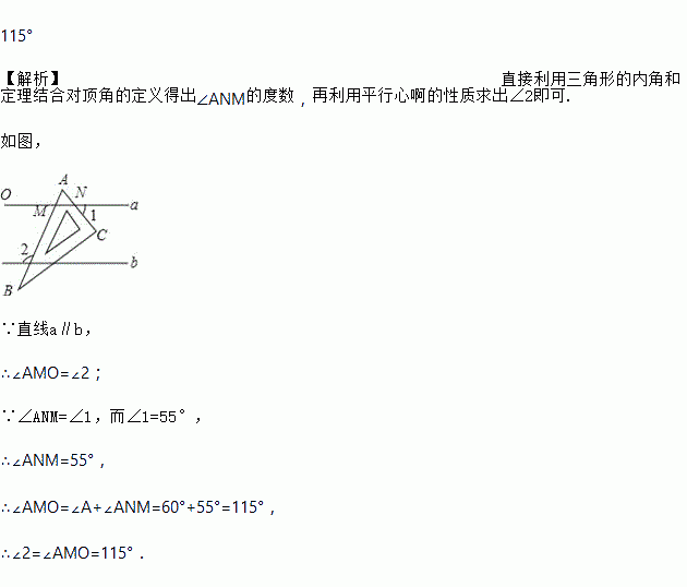 如图,直线a∥b,一块含60°角的直角三角板ABC(∠A=60°)按如图所示放置.若∠1=55°,求∠2的度数.