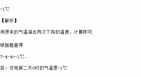 某地一天中午12时的气温是7℃,过5小时气温下降了4℃,又过7小时气温又下降了4℃,第二天0时的气温是多少?