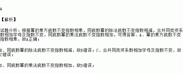 A 【解析】 试题分析:根据幂的乘方底数不变指数相乘,同底数幂的除法底数不变指数相减,合并同类项系数相加字母及指数不变,同底数幂的乘法底数不变指数相加,可得答案.A、幂的乘方底数不变指数相乘,故A正确; B、同底数幂的除法底数不变指数相减,故B错误;C、合并同类项系数相加字母及指数不变,故C错误; D、同底数幂的乘法底数不变指数相加,故D错误;
