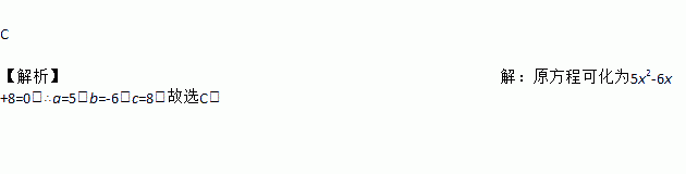 C 【解析】【解析】 原方程可化为5x2-6x+8=0,∴a=5,b=-6,c=8.故选C.