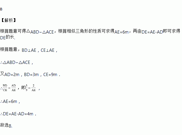如图,小东设计两个直角,来测量河宽DE,他量得AD=2m,BD=3m,CE=9m,则河宽DE为( )