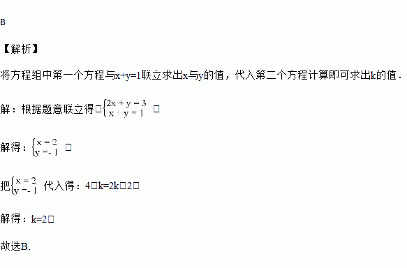 已知方程组的解中x与y之和为1,则k的值是( )