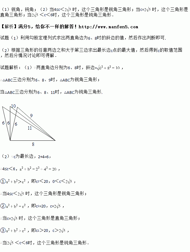 (1)请你通过画图探究并判断:当△ABC三边长分别为6,8,9时,△ABC为____三角形;当△ABC三边长分别为6,8,11时,△ABC为______三角形.