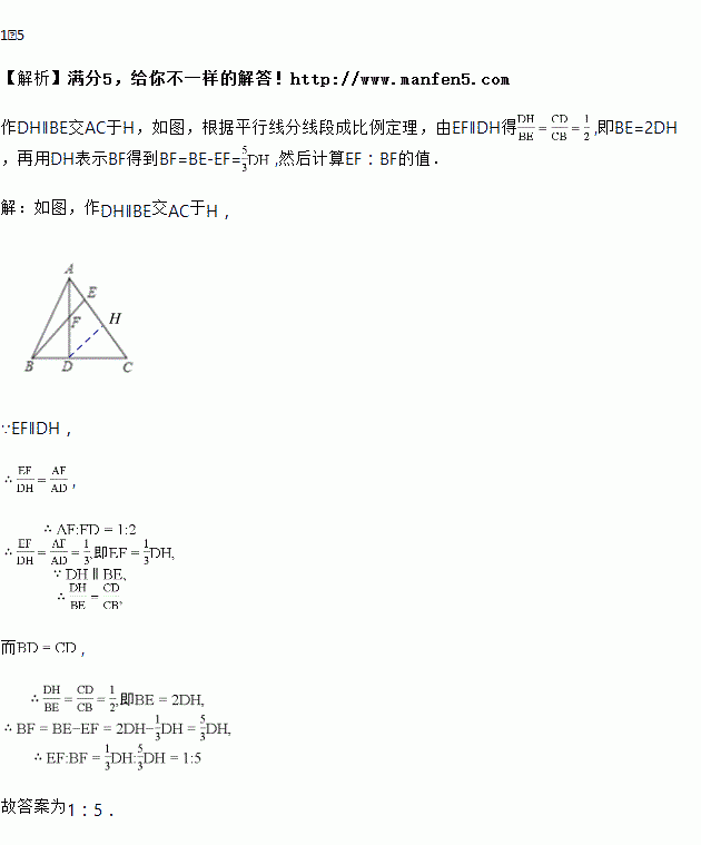 如图,△ABC中,AF:FD=1:2,BD=DC,则EF:BF=___________.