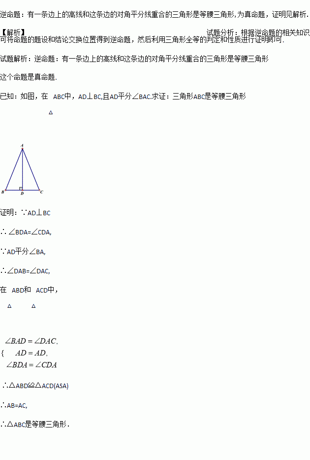 写出命题“等腰三角形底边上的高线与顶角平分线重合”的逆命题,这个逆命题是真命题吗?请证明你的结论