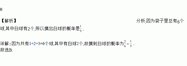 一个袋中装有1个红球,2个白球,3个黄球,它们除颜色外完全相同,小明从袋中任意摸出1个球,摸出的是白球的概率是 ( )