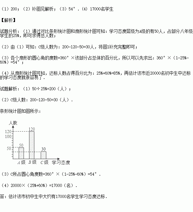 £¨4£©¸ù¾Ý³éÑùµ÷²é½á¹û£¬ÇëÄã¹À¼Æ¸ÃÊнü20000Ãû³õÖÐÉúÖдóÔ¼ÓжàÉÙÃûѧÉúѧϰ̬¶È´ï±ê£¿£¨´ï±ê°üÀ¨A¼¶ºÍB¼¶£©