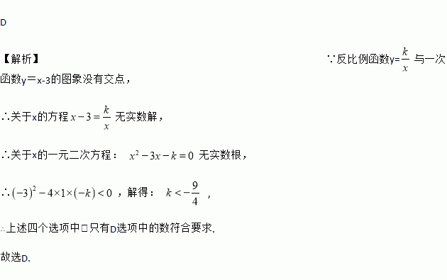 D 【解析】∵反比例函数y=与一次函数y=x-3的图象没有交点, ∴关于x的方程无实数解, ∴关于x的一元二次方程: 无实数根, ∴,解得: , ∴上述四个选项中,只有D选项中的数符合要求. 故选D.