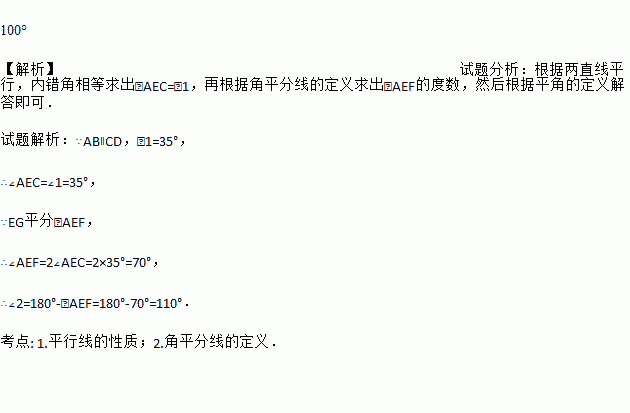 如图,AB∥CD,直线EF分别交AB、CD于点E、F,EG平分∠AEF,∠1=35º,那么∠2=_______度.