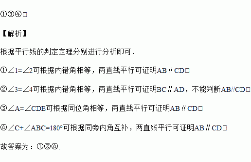 如图,点E在AD的延长线上,下列四个条件:①∠1=∠2;②∠3=∠4;③∠A=∠CDE;④∠C+∠ABC=180°.其中能判断AB∥CD的是_____(填写正确的序号即可)