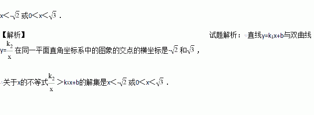 直线l1:y=k1x+b与双曲线l2:y=在同一平面直角坐标系中的图象如图所示,则关于x的不等式>k1x+b的解集为___________.