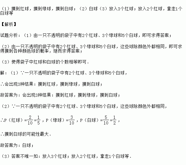 (3)怎样改变袋子中红球和白球的个数,使摸到这两种颜色球的概率相同?