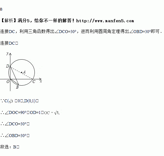 如图,⊙A过点O(0,0),C(,0),D(0,1),点B是X轴下方⊙A上的一点,连接BO,BD,则∠OBD的度数是( )