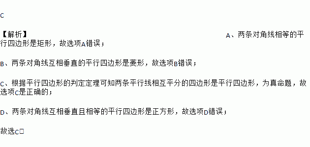 C 【解析】A、两条对角线相等的平行四边形是矩形,故选项A错误; B、两条对角线互相垂直的平行四边形是菱形,故选项B错误; C、根据平行四边形的判定定理可知两条平行线相互平分的四边形是平行四边形,为真命题,故选项C是正确的; D、两条对角线互相垂直且相等的平行四边形是正方形,故选项D错误; 故选C.