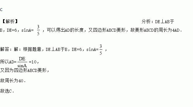 C 【解析】分析:DE⊥AB于B,DE=6,sinA= ,可以得出AD的长度,又四边形ABCD菱形,故菱形ABCD的周长为4AD. 解答:【解析】 根据题意,DE⊥AB于B,DE=6,sinA=, 所以AD==10, 又因为四边形ABCD菱形, 故周长为40. 故选C.
