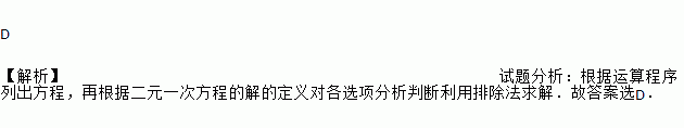 D 【解析】试题分析:根据运算程序列出方程,再根据二元一次方程的解的定义对各选项分析判断利用排除法求解.故答案选D.