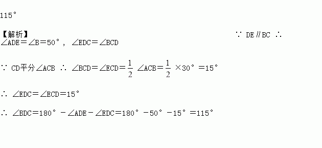 如图,已知CD平分ACB,DE∥BC,∠B=50°,∠ACB=30°,求∠BDC的度数。
