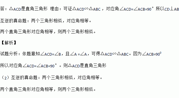 答:△ACD是直角三角形 理由:可证△ACD∽△ABC ,对应角∠ACD=∠ACB=90°所以CD⊥AB 互逆的真命题:两个三角形相似,对应角相等。 两个直角三角形对应角相等,则两个三角形相似。 【解析】 试题分析:依题意知∠ACD=∠B,且∠A =∠A,可得△ACD∽△ABC。因为∠ACB=900 所以对应角∠ACD=∠ACB=90°。则△ACD是直角三角形 ...
