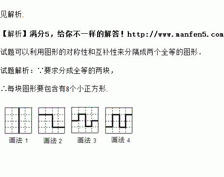 把大小4×4的正方形方格图形分割成两个全等图形,例如,图1,请在图2中,沿着虚线画出四种不同的分法,把4×4的正方形方格图形分割成两个全等图形.