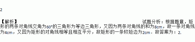 矩形的两条对角线的一个交角为60o,两条对角线的和为8cm,则这个矩形的一条较短边为 cm.