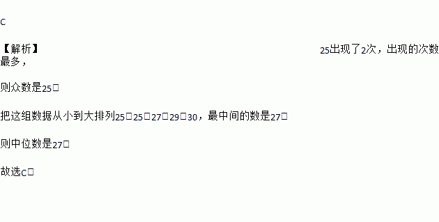我市四月份某一周每天的最高气温(单位:℃)统计如下:29,30,25,27,25,则这组数据的中位数与众数分别是( )