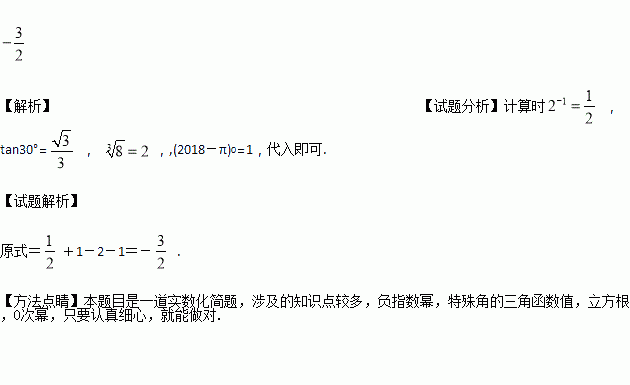 计算:2-1+·tan30°--(2018-π)0.