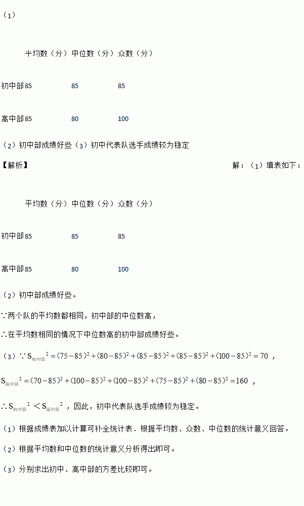 (2)结合两队成绩的平均数和中位数,分析哪个队的决赛成绩较好;