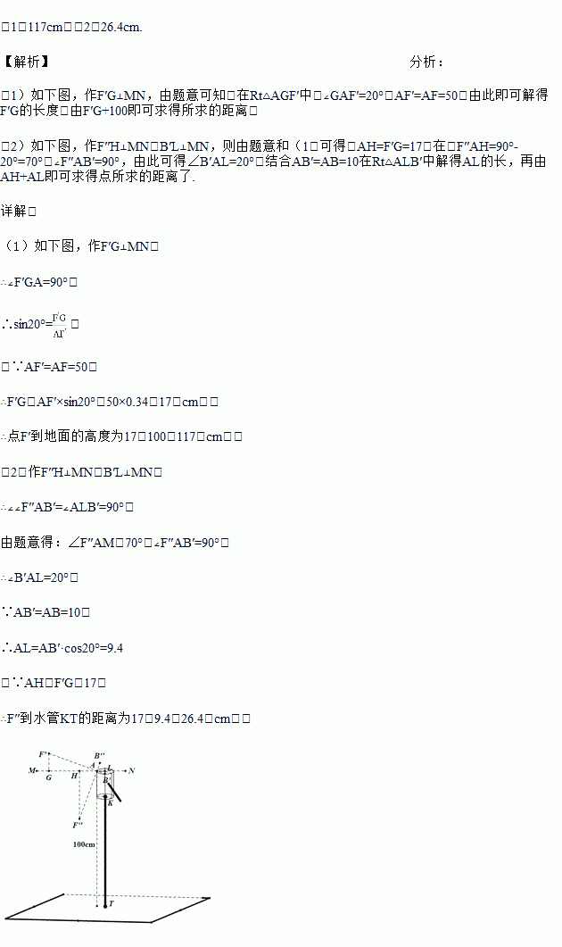 £¨2£©µ±²»È¡Ë®Ê±£¬½«ÊÖ±úÈÆÖ§µãAÄæÊ±ÕëÐýת90¡ãÖÁµãF¡ä¡äλÖã¬Çó¶ËµãF¡ä¡äÓë½øË®¹ÜKTÖ®¼äµÄ¾àÀ룮£¨ºöÂÔ½øË®¹ÜµÄ´Öϸ£©£¨²Î¿¼Êý¾Ý£ºsin20¡ã¡Ö0£®34£¬cos20¡ã¡Ö0£®94£¬tan20¡ã¡Ö0£®36£©