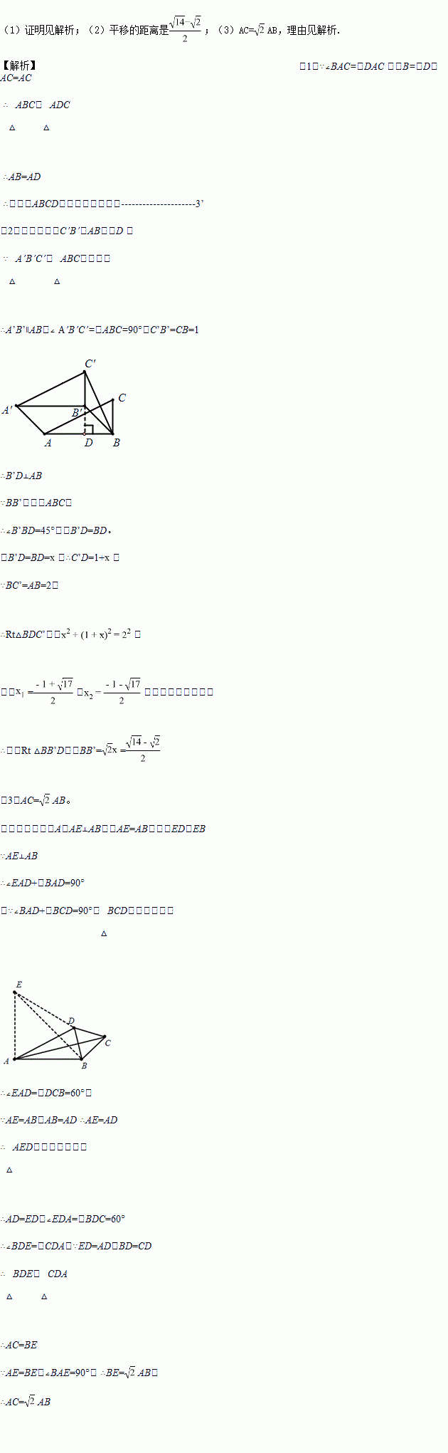 (2)如图2,Rt△ABC中,∠ABC=90°,AB=2,BC=1,将△ABC沿∠ABC的平分线BB′的方向平移,得到△A′B′C′,连接AA′、BC′,若平移后的四边形ABC′A′是等邻边四边形,且满足BC′=AB,求平移的距离.