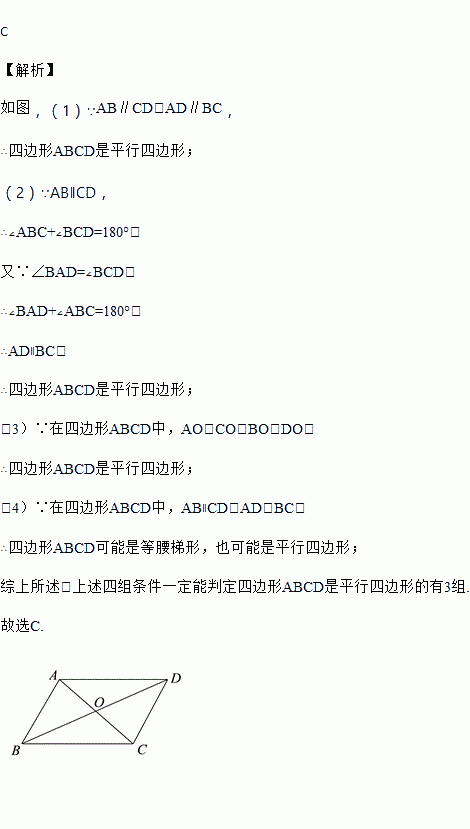 四边形ABCD中,对角线AC、BD相交于点O,给出下列四组条件:①AB∥CD,AD∥BC;②AB=CD,AD=BC;③AO=CO,BO=DO;④AB∥CD,AD=BC。其中一定能判断这个四边形是平行四边形的条件共有