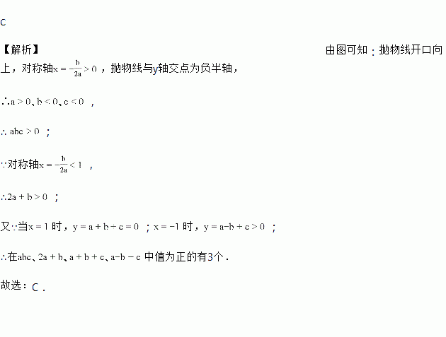 C 【解析】由图可知:抛物线开口向上,对称轴,抛物线与y轴交点为负半轴, ∴, ∴ ; ∵对称轴, ∴; 又∵当时,;时,; ∴在中值为正的有3个. 故选:C.